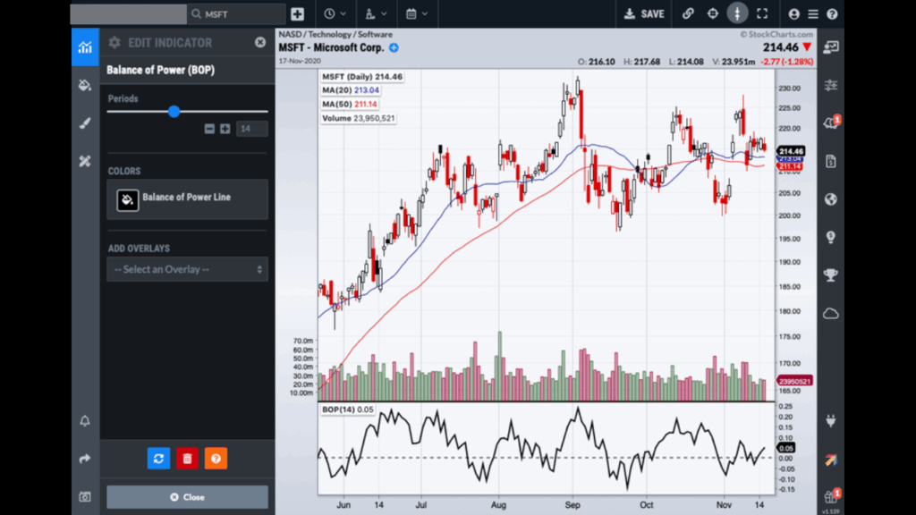 Once the plug-in is installed, the Balance of Power indicator can be added from the Chart Settings panel for your investment iq
