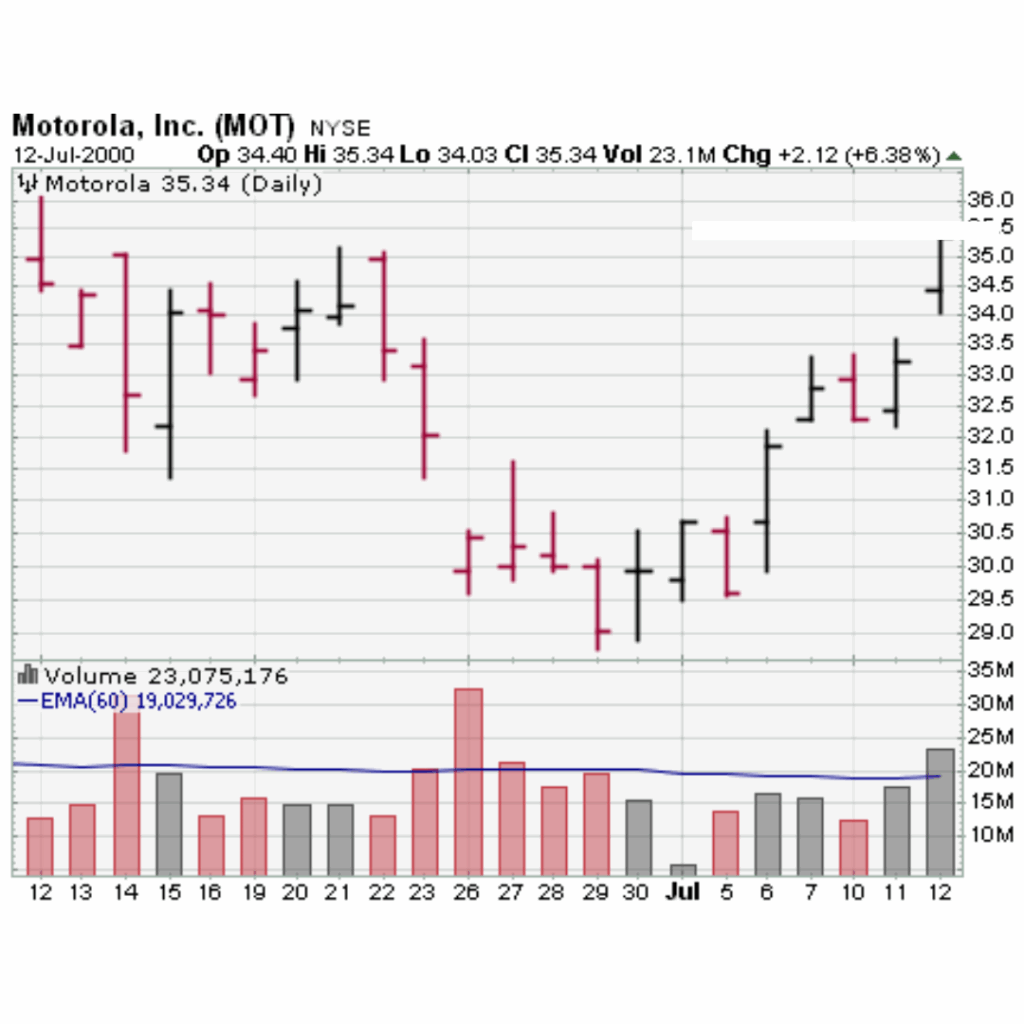 In the chart below for Motorola (MOT), we can see that a buy at $30 on June 30th would have been a flat trade on July 3rd, but rose $2 and $3 a share in the two days following the July 4th holiday.