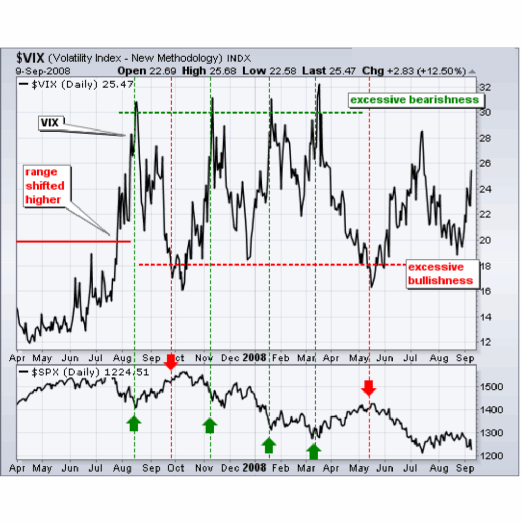 Typically, the VIX and other volatility indices have an inverse relationship to the stock market. VIX advances when stocks decline and declines when stocks advance. It seems that volatility would be immune to market direction, but the stock market has a bullish bias overall. A rising stock market is viewed as less risky, while a declining stock market carries more risk. The higher the perceived risk, the higher the implied volatility. Hence, this implied volatility is very susceptible to directional movement. A downswing or extended decline increases the demand for put options, which in turn increases put prices and the implied volatility. Puts are bought as a hedge against long positions or as a directional bet. This is why many analysts consider the VIX a coincident indicator. It moves when stocks move, not independently of stocks. In fact, VIX can be used as a trend-confirming indicator because it often trends in the opposite direction of the stock market. Despite a tendency to trend, the VIX can also trade in ranges that mark sentiment extremes. These extremes can be identified to anticipate stock market reversals.