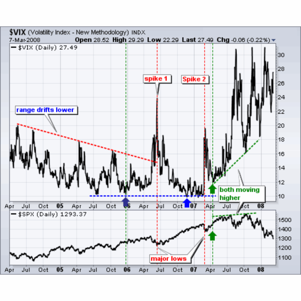 An unusual “coupling” of the Cboe Volatility Index occurred from April 2007 until October 2007. Instead of the normal inverse relationship, both stocks and the VIX moved higher during this timeframe. The S&P 500 recorded its high in October 2007 as the VIX traded above 16 (well above its lows around 10). Something is not right when the VIX and S&P 500 rise together. This abnormal coupling served as a warning sign that foreshadowed an extended decline from October 2007 until February 2009.