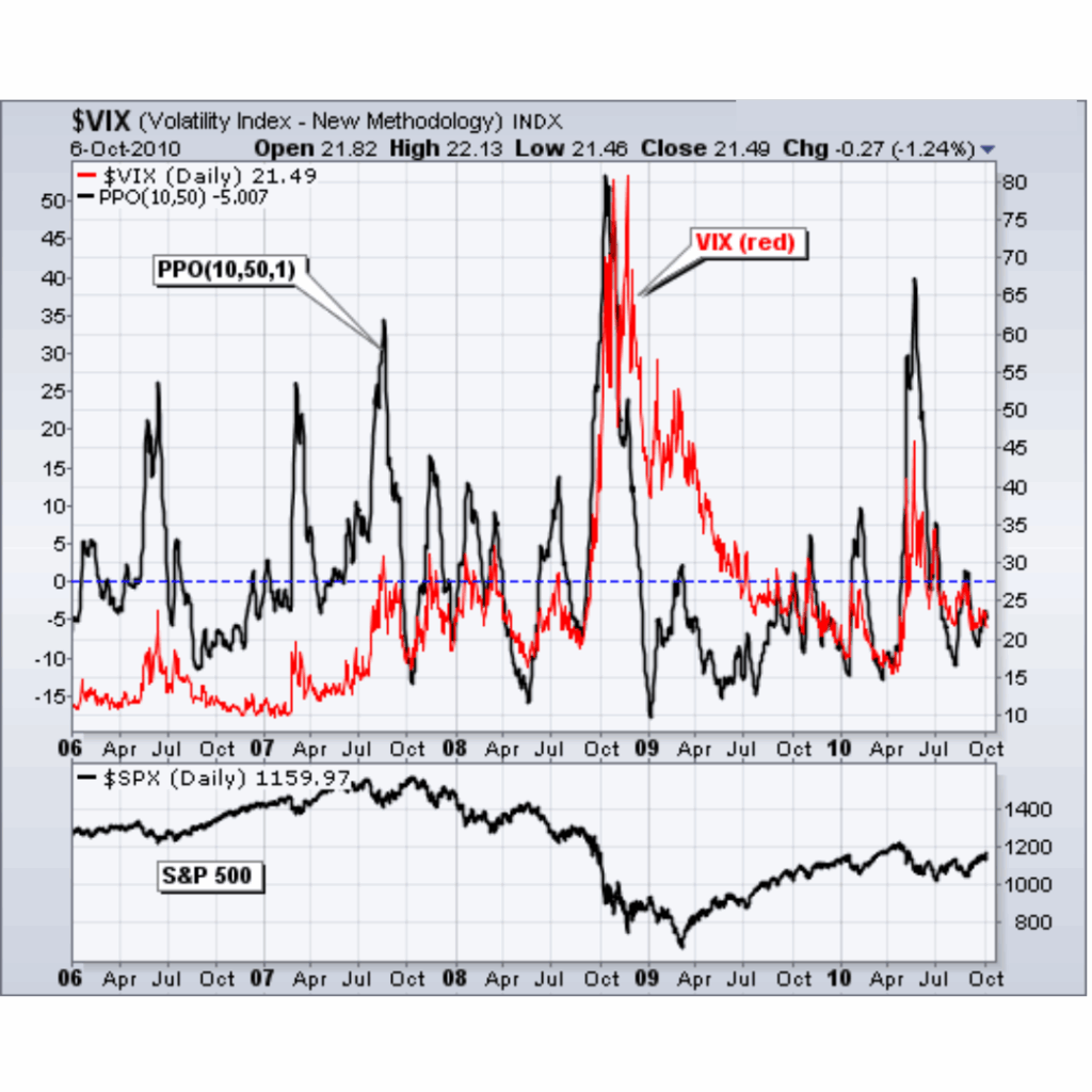 The next chart shows the Percent Price Oscillator for the VIX without the VIX. Unlike the VIX plot, the VIX PPO(10,50,1) oscillates above and below the zero line. There was a fairly well-defined range from 2006 to mid-2008 as the PPO produced some good signals for both extremes. This range expanded as volatility expanded at the end of 2008. The PPO exceeded 50 in October 2008, then plunged below -17 in January 2009. After reaching its lowest level in years, the VIX PPO remained at relatively low levels and did not exceed 10 until the surge to 40 in April-May 2010. This spike represented a bearish extreme.