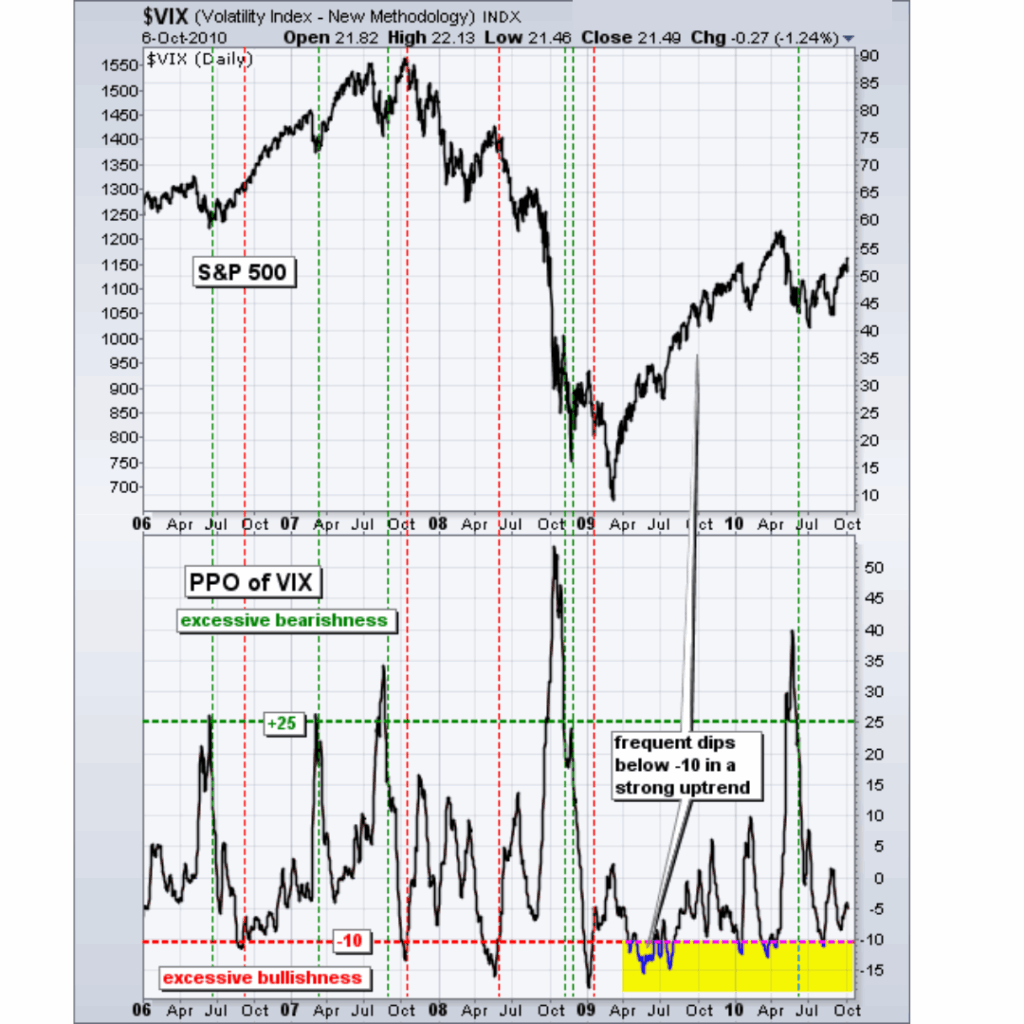 The green dotted lines show when the VIX PPO moved back below its bearish extreme (25). As with the VIX, timing can be improved by waiting for a reversal back below 25. Notice how the VIX PPO moved above 25 in September 2008 and remained above 25 for several weeks as the market continued to fall. Turning bullish on the initial move above 25 would have been costly. The red dotted lines show periods of excessive bullishness from September 2006 until January 2009. After the market bottomed in March 2009, the VIX PPO moved below -10 quite often and these excessive bullishness signals did not work during the strong uptrend.